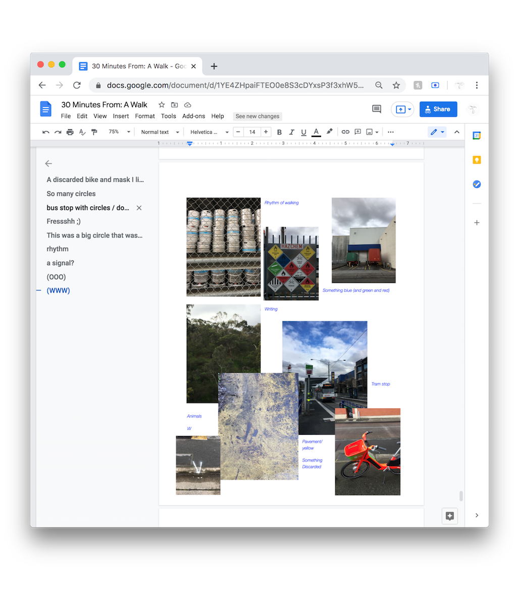 Prompted by Covid-19 restrictions this invitation has been extended to wherever you may be, whenever you get there. Rather than meeting at one time and space, as originally planned, we will now meet on a collaborative google doc where images, thoughts and reflections from our walks will connect our experiences, forming a shared archive. In the guide there will be suggested routes that can be used as reference for your own walk, but you can take part in this exercise whenever and wherever is possible for you.