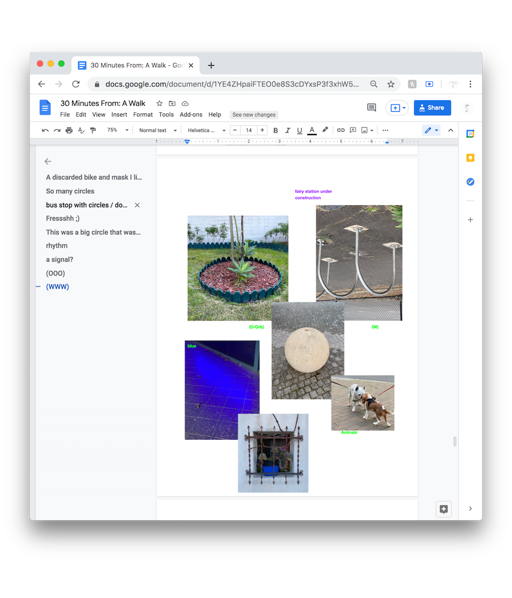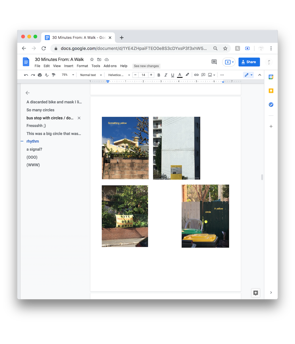 Prompted by Covid-19 restrictions this invitation has been extended to wherever you may be, whenever you get there. Rather than meeting at one time and space, as originally planned, we will now meet on a collaborative google doc where images, thoughts and reflections from our walks will connect our experiences, forming a shared archive. In the guide there will be suggested routes that can be used as reference for your own walk, but you can take part in this exercise whenever and wherever is possible for you.